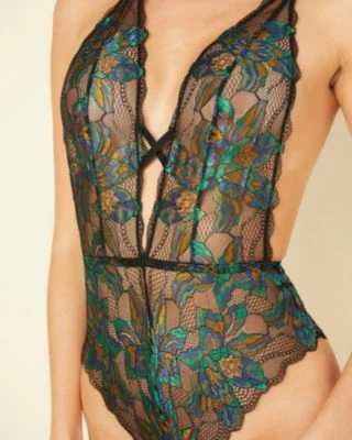 Elevate your every day with this striking one-piece bodysuit. The Paradiso Teddy is a wireless, unlined style made with multi-dimensional floral lace featuring colorful shimmer detail for added luxury. Halter straps lay against your neck that meet a plunging neckline and open back for the sultriest of looks. Transport yourself to ‘paradise’ with this unique look!