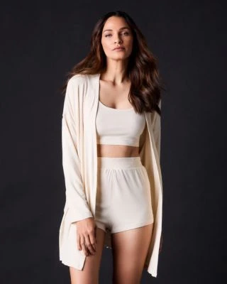 Perfectly paired and just as comfy, this sweet set features a cropped cami and pull-on shorts with coordinating cardigan for the perfect leisure day look.