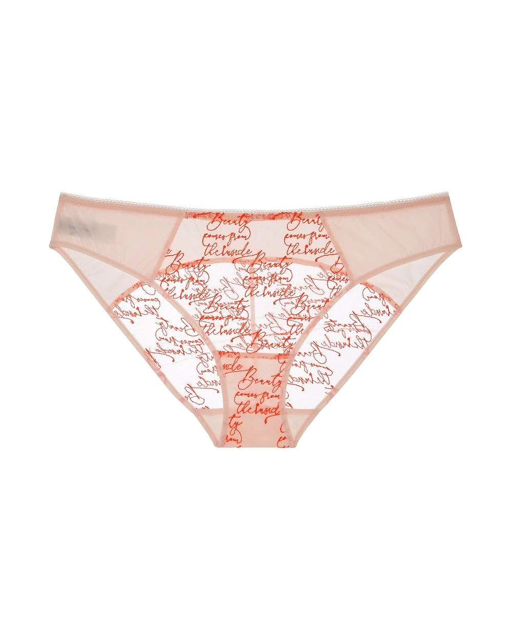 You will feel beautiful while wearing this luxurious brief style, constructed of ultra-sheer mesh. Made in France, this low-rise brief has the word “beauty” embroidered all over, paired with mesh paneling that will lay across your hips. Moderate rear coverage with sweetheart effect with the lace for a flirty detail.